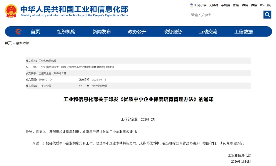 2026年1月16日,工信部新版《优质中小企业梯度培育管理办法》正式出台,自2026年4月1日起全面实施,明确废止旧版中专精特新中小企业和“小巨人”企业的相关条款及认定标准。